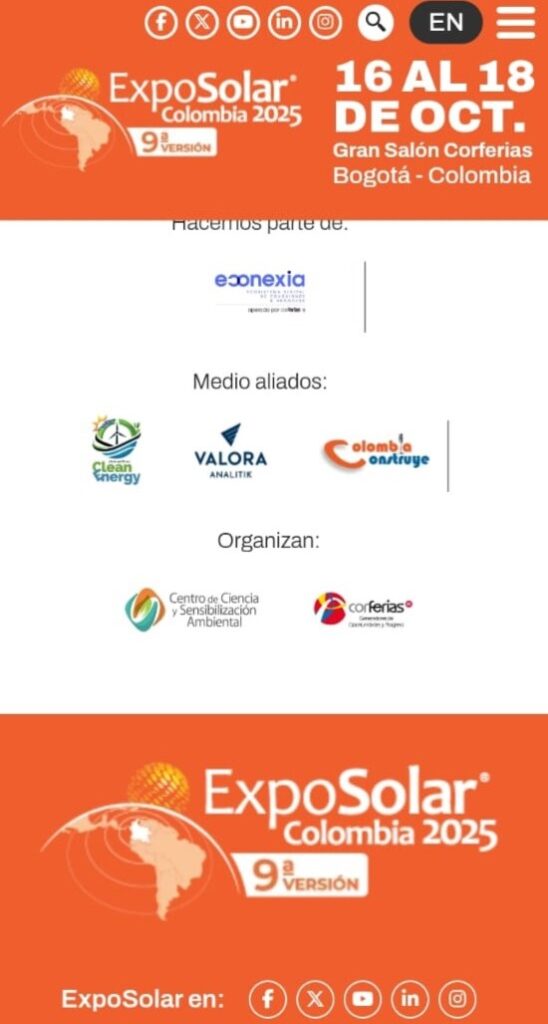 ¡Del 16 al 18 de octubre se estará celebrando en Corferias la novena versión de “¡Expo Solar” y el IX Congreso Internacional Almacenamiento de energía, una nueva era de alta confiabilidad! Informes e inscripciones en la página https://feriaexposolar.com/es