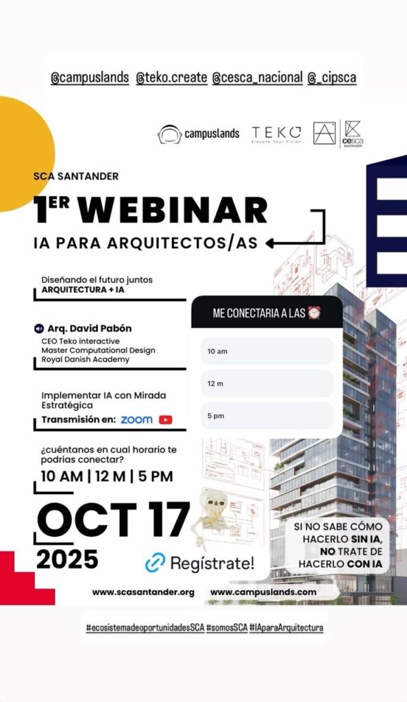 La Sociedad Colombiana de Arquitectos – Regional Santander y Campuslands realizarán el 17 de octubre el Webinar IA para arquitectas y arquitectos “Si no sabe cómo hacerlo sin IA, no trate de hacerlo con IA” Mayores informes en la página www.scasantander.org Link de registro: https://forms.gle/VQHcEP11MNLbB6C68