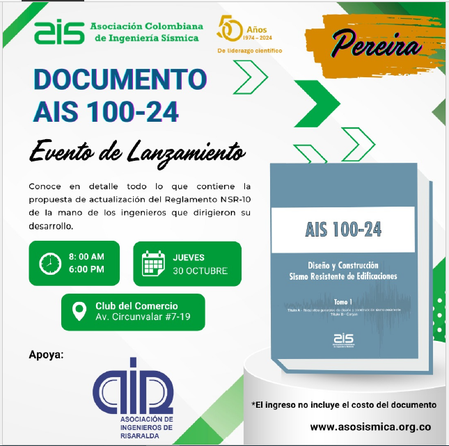 El 30 de octubre de 2025 la Asociación Colombiana de Ingeniería Sísmica (AIS) y la Asociación de Ingenieros de Risaralda estarán presentando en Pereira la actualización de la Norma AIS-100/24 y tendrán como ponentes las personas que tuvieron a cargo la coordinación de la norma en cada uno de sus títulos. Mayores informes en la […]