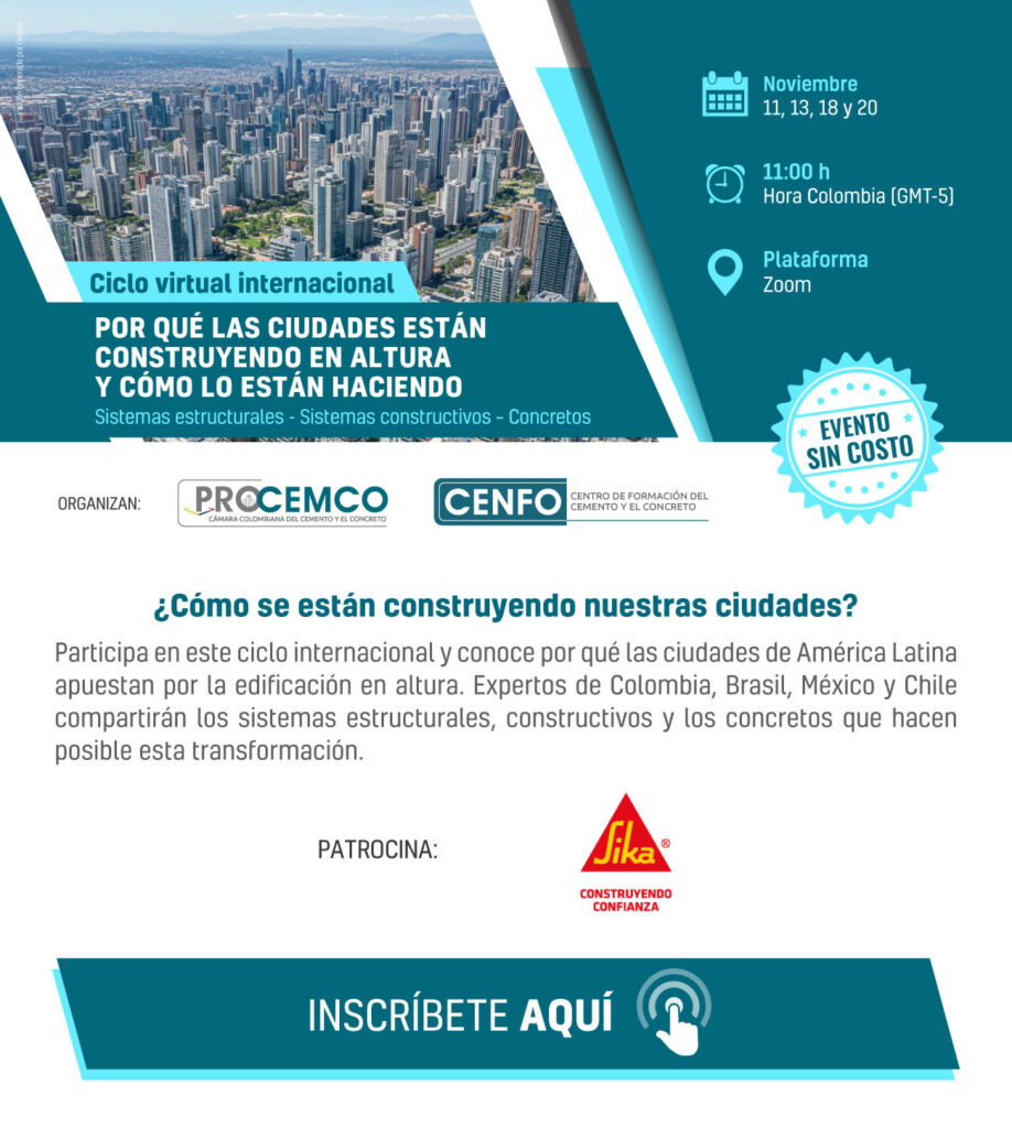 En su ciclo virtual internacional de conferencias gratuitas Procemco presenta “Por qué las ciudades están construyendo en altura y cómo lo están haciendo” el 18 de noviembre desde Brasil “Torres que transforman el paisaje Urbano” y el 20 de noviembre desde Chile Innovación vertical en zonas de alta sismicidad”. Informes en la página www.procem.co Inscripciones en https://us02web.zoom.us/webinar/register/WN_b0BkuMNvS_6jpNyEgN4_7w?utm_source=_PROCEMCO_&utm_campaign=2d87de5298-EMAIL_CAMPAIGN_2020_07_25_02_50_COPY_01&utm_medium=email&utm_term=0_9cf29739c1-2d87de5298-351442764#/registration