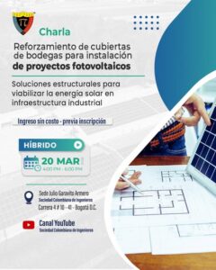 La Sociedad Colombiana de Ingenieros realizará el 20 de marzo de manera híbrida la charla Reforzamiento de cubiertas de bodegas para instalación de proyectos fotovoltaicos.